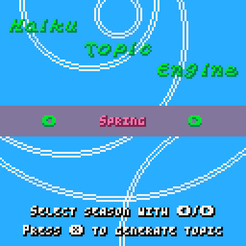 Searching for an idea for your next haiku or poem? The Haiku Topic Engine is here to help. This tool contains a database of kigo (season words) that haiku poets throughout the centuries have used to evoke the seasons. Select your preferred season, and the engine will provide you an appropriate kigo.